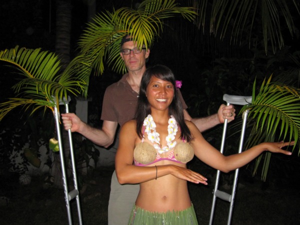 We went to a Halloween party at one of the local restaurant/bars on Sunday night. Costumes were mandatory. Michael dressed as a palm tree, gamely making his crutches part of the costume (including two baby coconuts hanging from the crutch on the left!), and I was a hula girl: