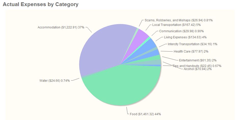 We’re still under budget, although costs have crept up a little bit, what with us moving around a lot more than Month 1, and not having a kitchen to cook our own meals. We’ve still managed to cut costs by: