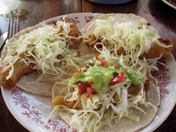 - The fish tacos at Dan’s Cafe Deluxe (attached to Hotel Casa De Dan). They only serve the fish tacos on Fridays and Saturdays, and are only open until 4 pm. The tacos are Baja-style: once piece of fish per taco with a nice, even breading and then deep fried, served with a smattering of shredded raw cabbage, and pico de gallo, spicy mayo and guacamole on the side. Best fish tacos I’ve had in my life!