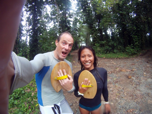 Bodysurfing is tons of fun; it’s also a great cardio workout — after only half an hour, I often feel like I’ve just run 3 miles. We do it with short fins on our feet (I like Da Fins), and the handplanes made and gifted to us by our friend Jon Wagner.