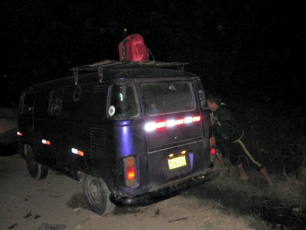 Second: the same day as the corrupt cop incident, we were heading to a beach called Playa Centinela, to camp at a hotel we’d heard was located in front of a point break. We arrived in the adjacent small town right before sunset, and headed out onto a dirt road toward the beach. We came upon a big puddle and, not knowing how deep it was at the deepest point, decided not to risk getting stuck, and headed back to town. We drove away from the puddle in reverse, right into an irrigation ditch! Both wheels on the passenger side were in the ditch, and walled in front and back by the road. We couldn’t just push the car out, or use blocks to get it out, since the wheels were too deep and walled in.