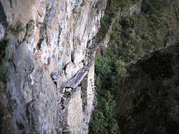 There’s an old Incan “bridge” that can be seen if you hike 20 minutes off the main ruins. Rumor has it that the bridge used to be open to tourists until a few years ago, when one fell to his death while crossing it. Now it’s gated off, and the approach to the bridge has ropes that you can hold onto for balance, since the drop off the side of the path is several hundred meters down.