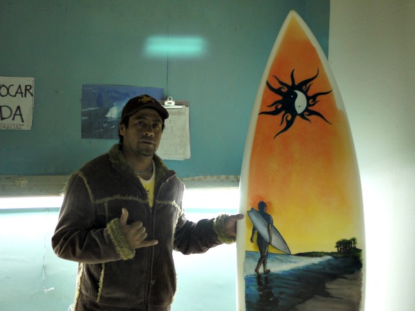 He turned out to be the only year-round resident of Portofino, Cristian Ramos (aka Chico Cristian), and he happened to be with two reporters from a national TV show called Chile Conectado, who were interviewing him about his interesting way of life at Portofino. Cristian surfs Portofino all year and lives off the grid, using solar panels. We surfed with Cristian that day (maybe even getting a speaking part on the TV program — we’ll see in a couple of weeks when it goes online!), and he and his good friend Mauro invited us to barbecue with them that evening. We had a fun time chatting, eating and watching a Chilean surf movie together.